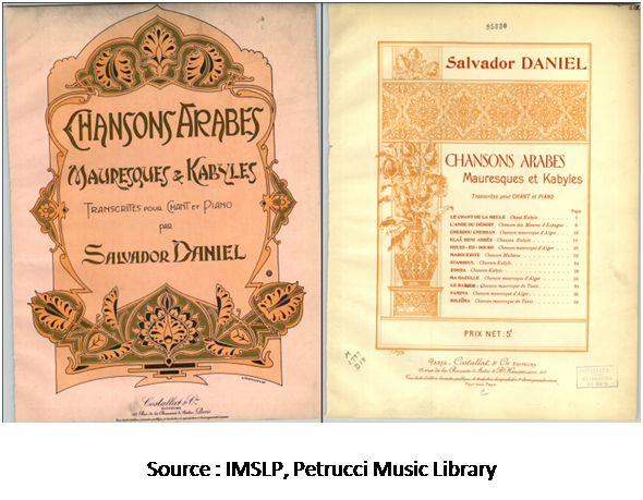 – Illustrations et partitions des Chansons arabes, mauresques et kabyles par Francisco Salvador Daniel, IMSLP – Petrucci Music Library